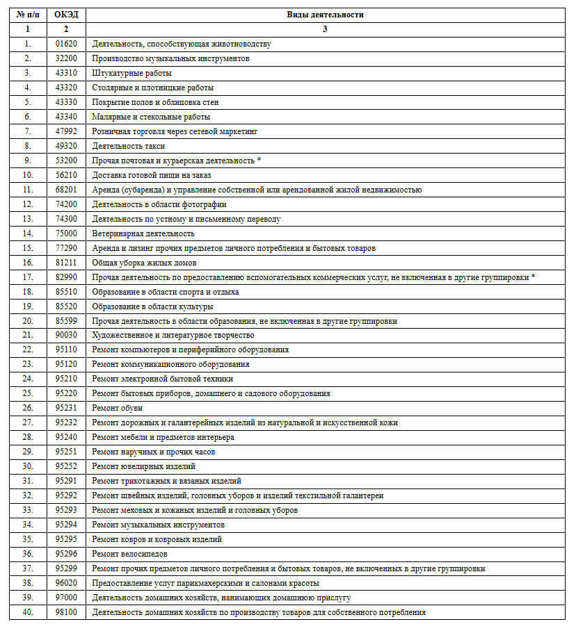 Тізбедегі 40 түрлі қызметтің ішінде мал шаруашылығына ықпал ететін қызмет түрі, музыкалық аспаптар өндірісі, ағаш ұсталығы, желілік маркетинг арқылы бөлшек сауда жүргізу, баспана арендасы, ауызша және жазбаша аударма, ветеринариялық қызмет, тапсырыспен дайын тамақ жеткізу, пошта және курьер қызметі сияқты кәсіпкерлік түрлері бар.